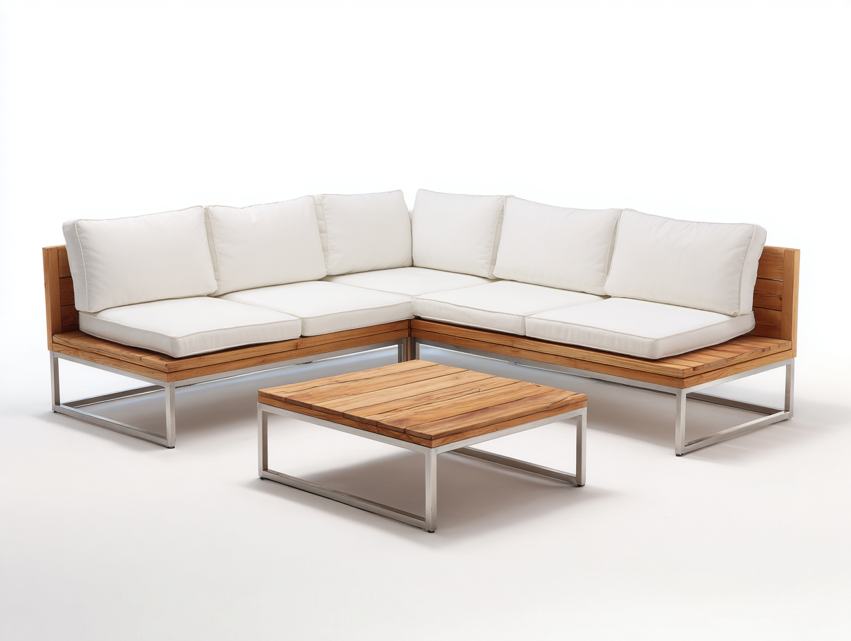Die symmetrische Eckform nutzt Außenflächen effizient und schafft einen durchgehenden Sitzbereich. Der Tisch ergänzt das Möbelstück mit einer stabilen Ablagefläche für Getränke, Bücher oder Dekoration. Die Kombination aus Metallrahmen, Holzoberflächen und gepolsterten Sitzflächen sorgt für Stabilität und angenehmen Komfort.