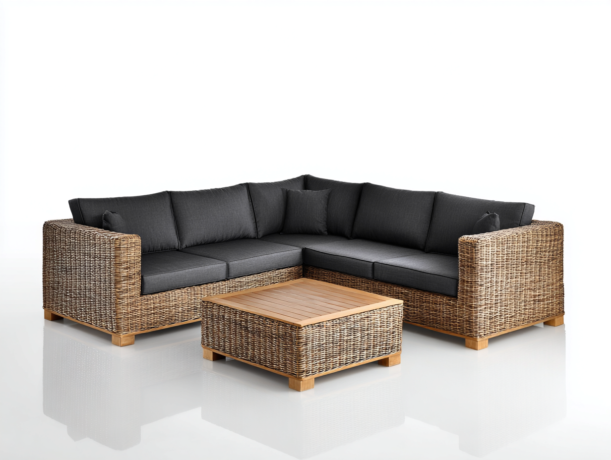 Die symmetrische Eckform nutzt Außenflächen effizient und schafft einen durchgehenden Sitzbereich. Der Tisch ergänzt das Möbelstück mit einer stabilen Ablagefläche für Getränke, Bücher oder Dekoration. Die Kombination aus Polyrattanstruktur und gepolsterten Sitzflächen verbindet Stabilität mit komfortabler Nutzung im Gartenbereich.